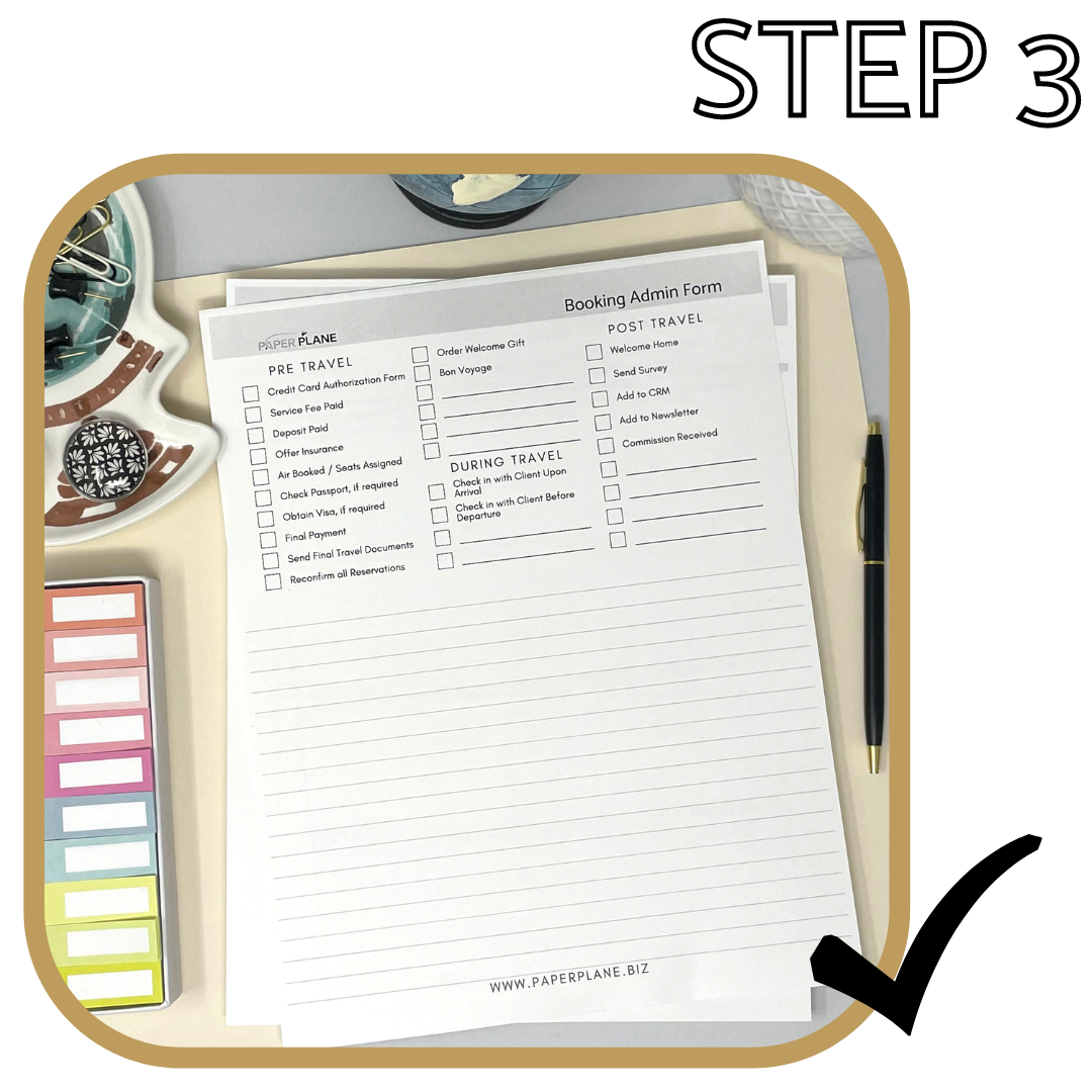 Keep your confirmations in order with the Booking Admin Form and Checklist. Track deposit amounts, important payment dates, and the travel components you have confirmed.