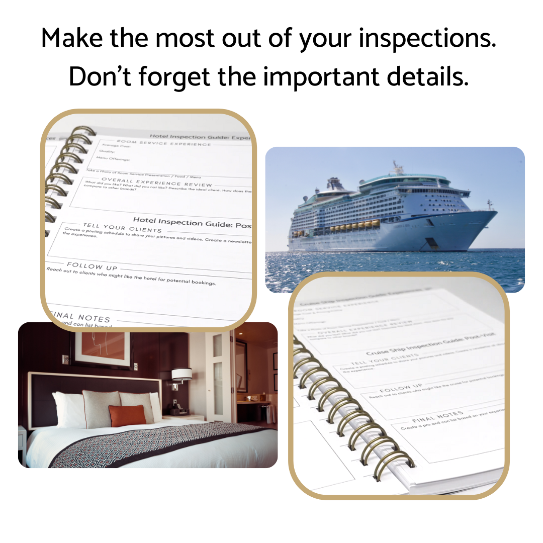 Paper Plane's Inspection Guide Workbook contains 3 different site inspection guides: Hotel, Cruise Ship, and Destination / Port. With these forms at the ready when you are on a site inspection, you will have all your notes in one place, easily relaying information to your clients.