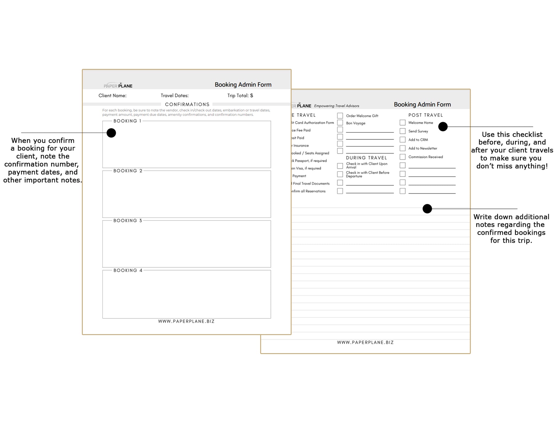 Keep your confirmations in order with the Booking Admin Form and Checklist. Track deposit amounts, important payment dates, and the travel components you have confirmed.
