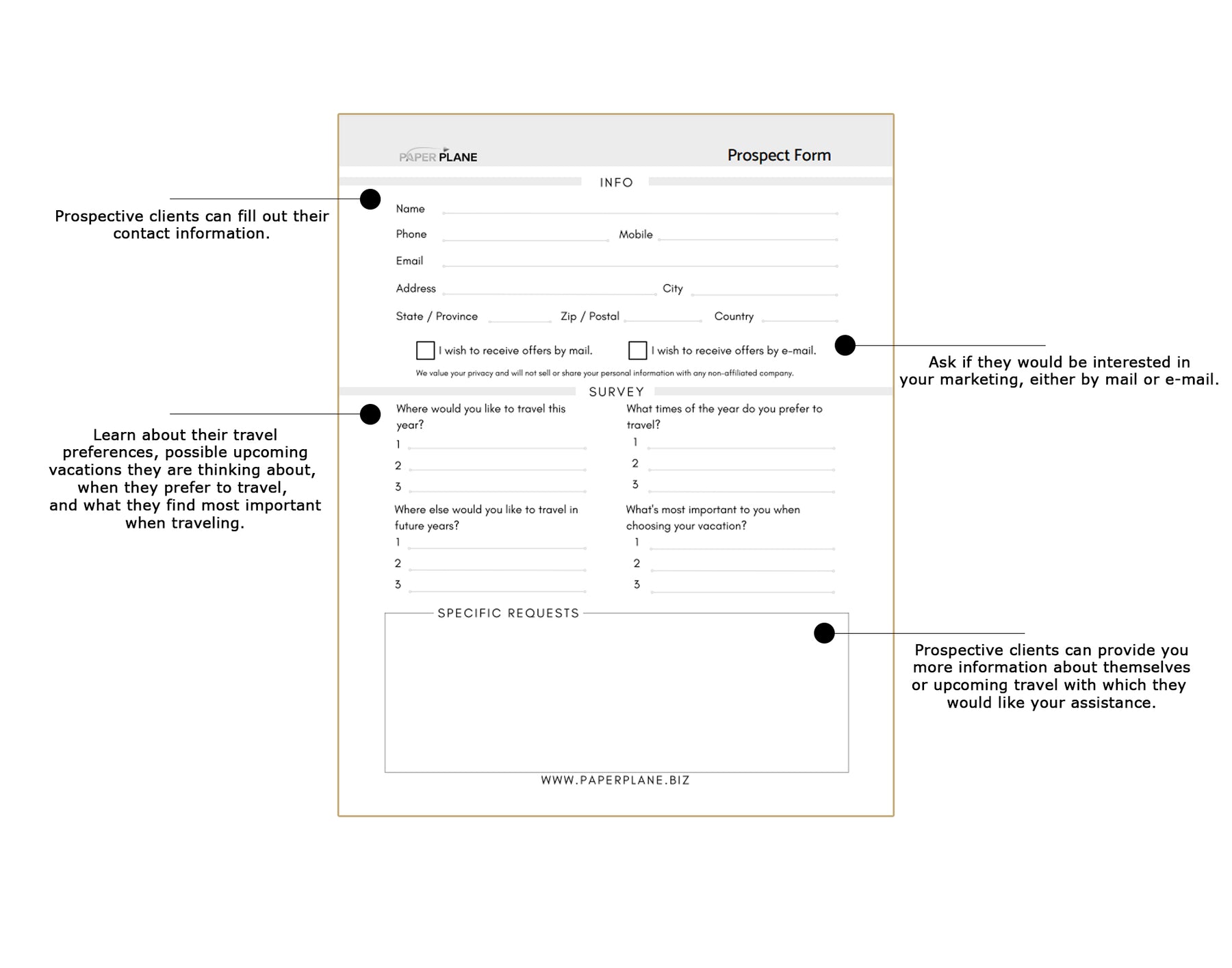 Whether you have a booth at a travel event or are hosting one of your own, keep this Prospect Form pad on hand for potential clients to fill out. Collect their contact information and learn a little more about their future travel plans.